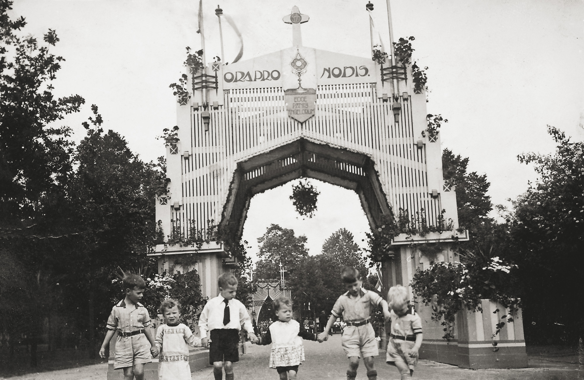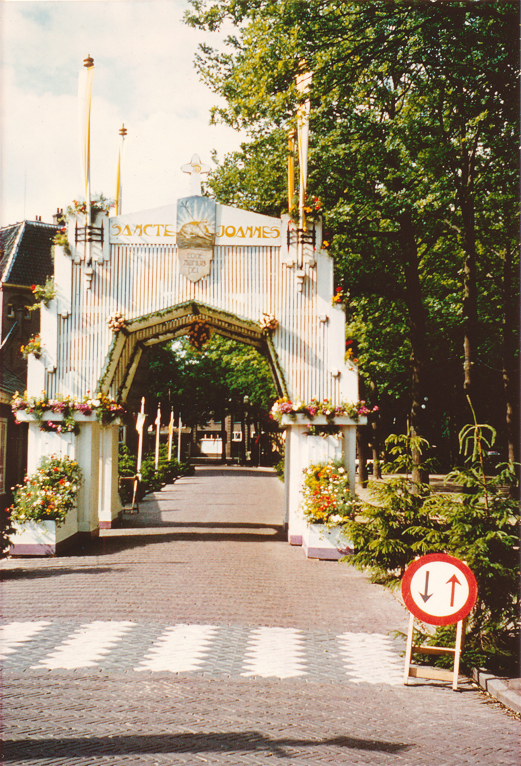 De nieuwe erepoort werd voor het eerst opgericht in 1986 ter gelegenheid van het honderdjarig bestaan van de sacramentsprocessie. Ik maakte zelf het ontwerp, waarbij ik mij onder andere liet inspireren door een ander exemplaar, van architect Elzinga. Uit de oudere bogen kwamen de twee schilderingen van Toon de Jong mee: het lam Gods, aangevuld met de tekst ‘Ecce Angus Dei’ en het heilig sacrament met de tekst ‘Panus Angelorum’.